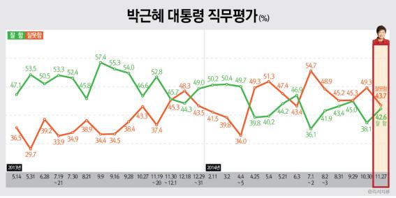조사결과 박근혜 대통령 긍정평가는 10월말 대비 4.5%p 오른 42.6%를 기록하며 다시 40%대를 회복한 것으로 나타났다.
