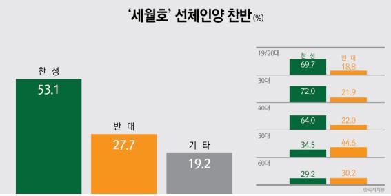 ▲ ‘세월호’ 선체인양 “찬성(53.1%) vs 반대(27.7%)”, 찬성이 25.4%p 더 높아 © 로컬세계 |