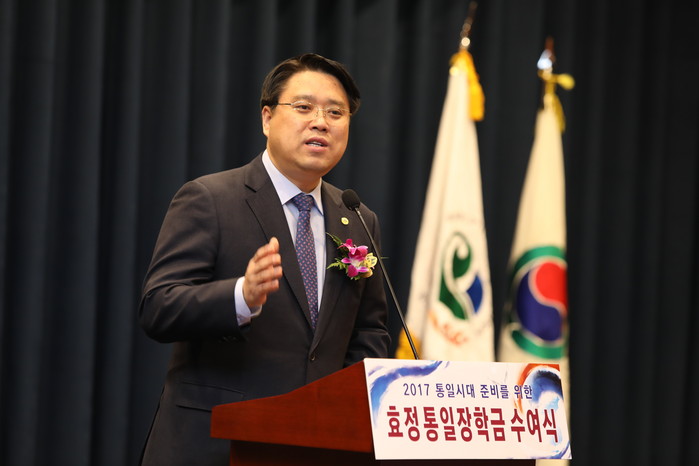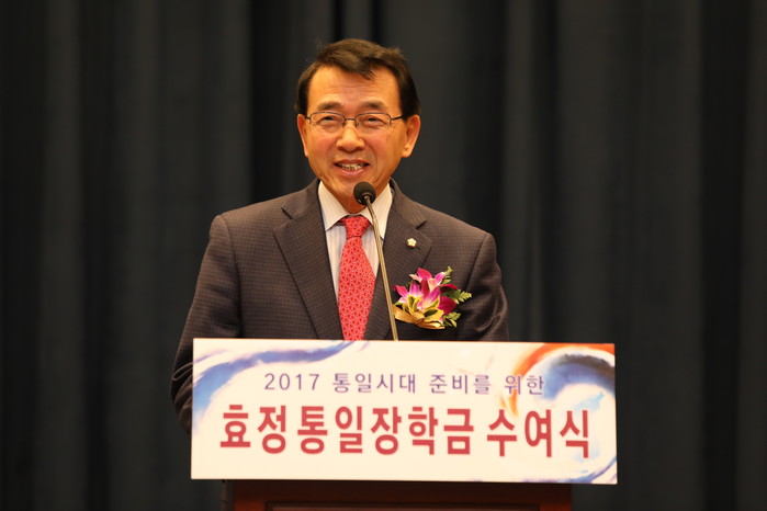 ▲심재권 외교통일위원장이 28일 국회의원회관에서 열린 효정통일장학금 수여식에서 축사를 하고 있다. |