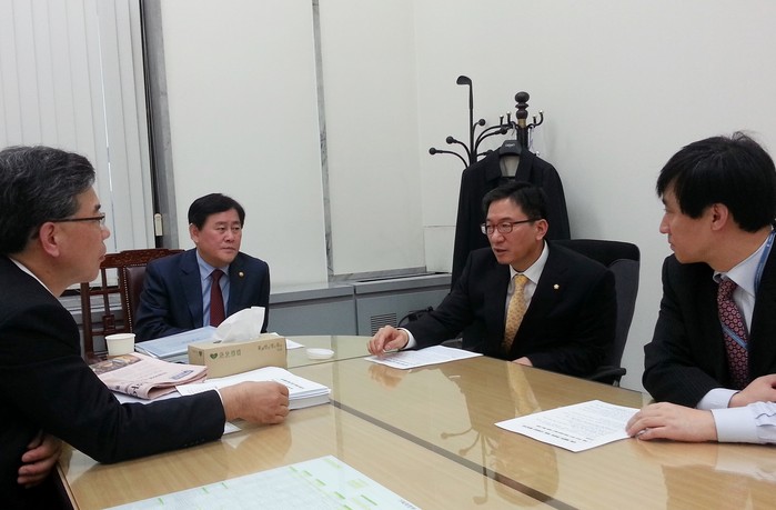 ▲지난 9일 정성호 의원(오른쪽 두 번째)이 최경환 부총리(가운데)에게 전철 7호선 양주 연장사업 예비타당성조사 통과방안을 전달하고 연내 통과를 강력 요구하하고 있다 |