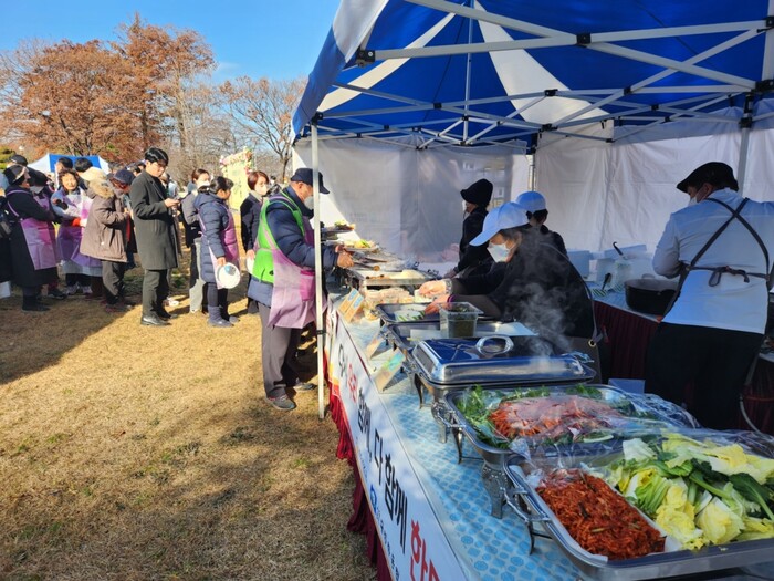 ▲ 1일 국회 헌정회 인근에서 열린 ‘국회 생생텃밭 김장나눔행사’ 봉사자들이 한돈 수육을 즐기고 있다. |