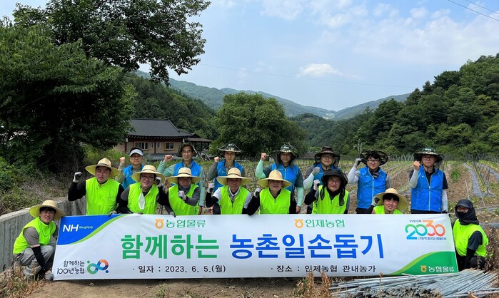농협물류 임직원 20여 명도 5일 강원도 인제군 농가를 방문해 고추 지주대 설치 작업과 마을 환경정비 등 일손돕기를 실시했다.