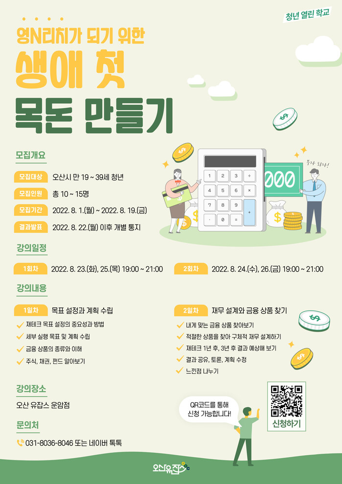 이 프로그램은 오산시를 생활권으로 하는 만 19세부터 39세 청년을 대상으로 진행될 예정이다. 회차별 10명 선착순 모집으로 유잡스 블로그나 인스타그램에 안내된 구글 설문지 등을 통해 온라인으로 신청이 가능하다.