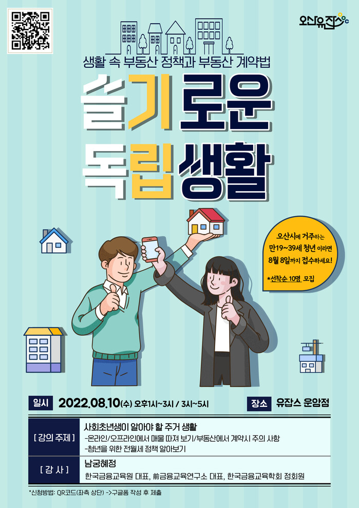 첫 번째 특강 ‘슬기로운 독립생활, 생활 속 부동산 정책 및 계약법’에서는 부동산 계약 주의사항과 청년을 위한 전월세 정책을 주제로 한다.