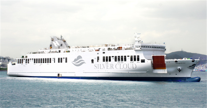 총 톤수 2만263GT, 길이 160m, 폭 25m 규모의 실버 클라우드호는 여객 정원 1180명과 차량 150대를 동시에 적재 가능한 대형 카페리 여객선이다.