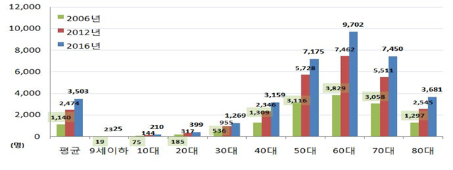 2016년 기준으로 고지혈증으로 진료를 받은 환자 수를 연령대별 인구수를 고려한 ‘인구 10만 명 당’진료인원을 분석해 본 결과, 가장 많은 연령대는 60대로 9702명이었다. 뒤이어 70대 7450명, 50대 7175명 순으로 중·장년층의 인구대비 ‘고지혈증’환자 수가 많았다.