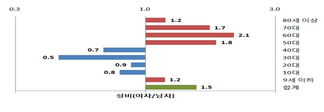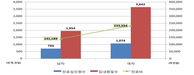 반면, 50대 이상에서는 여성 진료인원이 남성 진료인원보다 많은 것으로 나타났다. 60대에서 10만 명 당 여성 진료인원이 남성 진료인원의 약 두 배였다.