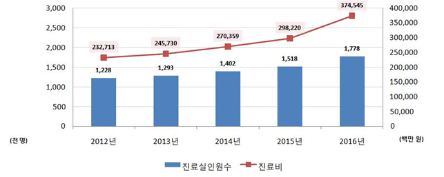 2016년 기준 ‘고지혈증’으로 인한 진료비 지출은 3745억원으로 2012년 2327억원 대비 60.9%(1418억원) 증가해, 연평균 12.6% 증가율을 보였다. 입・내원일수는 2016년 559만 일로 2012년 369만 일 대비 51.4%(189만 일) 증가한 것으로 나타났다.