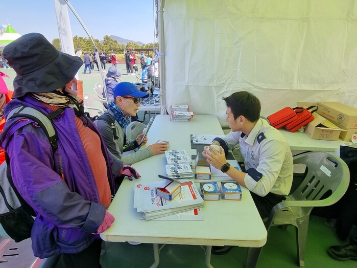 | ▲부산 남부소방서는 지난 8일 열린 '제39회 남구 오륙도사랑 걷기대회'에서 '주택용 소방시설(단독 경보형감지기) 설치 및 심폐소생술(CPR)교육' 홍보 부스를 운영했다. 부산 남부소방서 제공 |