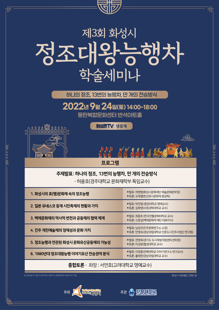 주제발표는 허용호 경주대학교 특임교수가 맡았으며, 1부에서는 허명범 화성시문화재단 예술문화본부장, 박전열 중앙대학교 명예교수, 최종호 한국전통문화대학 교수, 남성진 진주문화연구소 소장이 국내외 근대시민축제와 정조대왕능행차를 비교 분석할 예정이다.