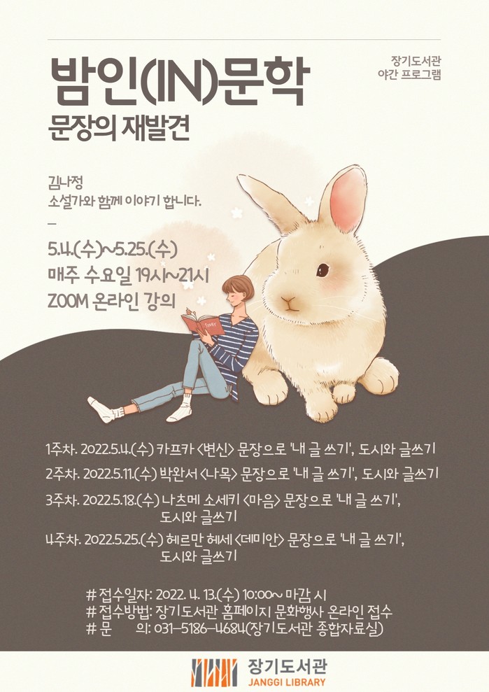 [로컬세계 김병민 기자]경기 김포시 장기도서관은 오는 5월 4일 19시부터 지난 4월에 이어 야간 프로그램 ‘밤인(IN)문학-문장의 재발견’을 4주에 걸쳐 온라인 줌(ZOOM)으로 운영한다.