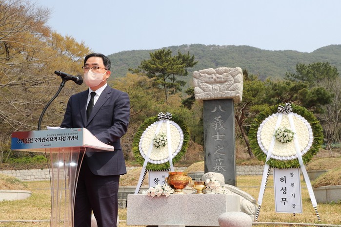 [로컬세계 권인진 기자]경남 창원특례시(시장 허성무)는 7일 오전 11시 창원 진전 8의사 묘역에서 경남동부보훈지청(지청장 박현숙)이 주관하는 ‘창원 진전 국가관리묘역 지정 기념식’이 열렸다고 밝혔다.