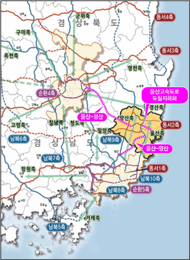 제3차 고속도로 건설계획 대상사업은, 울산~경산(L=50km, 3조 4,000억 원), 울산고속도로 도심지하화(L=11.5km, 1조 2,000억 원), 울산~양산(L=34.6km, 1조 4,990억 원) 구간에 대한 국가계획 반영을 위해 중앙정부와 협의를 진행 중이다.