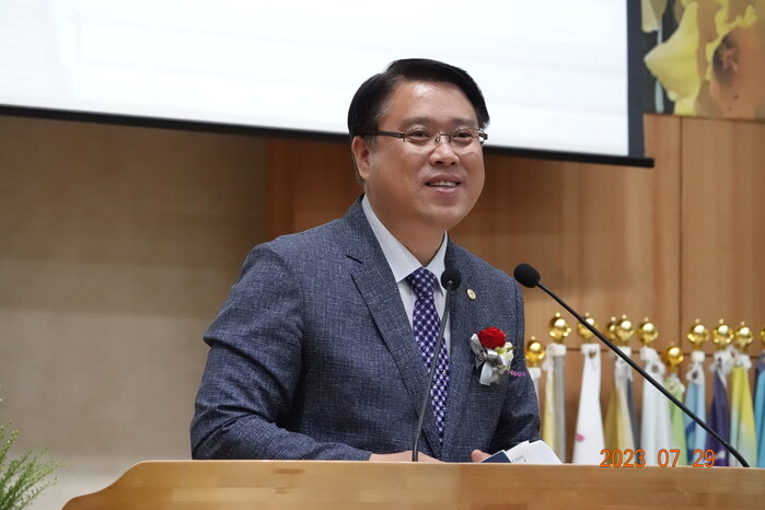 | ▲ 송광석 가정연합 한국협회장이 지난 29일 창원대교회에서 경남권역 순회 말씀을 하고 있다. 가정연합 제공 |
