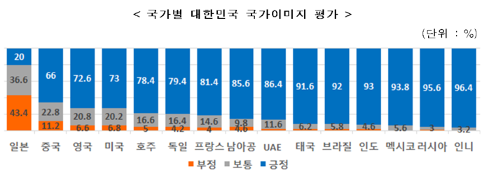 국가별 분석에 따르면 동남아(인도네시아·태국), 중남미(브라질·멕시코), 러시아가 대한민국의 이미지를 가장 긍정적으로 평가(긍정 90% 이상)했다. 서구권 국가(프랑스·독일·호주·미국·영국)의 긍정적 평가 비율도 높았다. 반면 일본(긍정 20%)의 긍정적 평가 비율은 낮았다.