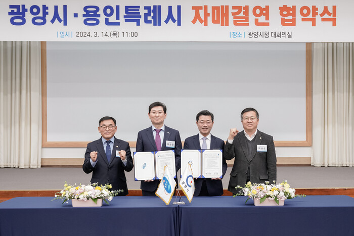 이날 협약식에는 윤원균 의장을 비롯해 이상일 용인시장, 정인화 광양시장, 서영배 광양시의회 의장 등 관계자들이 참석해 용인시-광양시 자매결연 추진에 따라 행정‧경제‧문화‧관광 등 각 분야 발전을 위해 공동 노력하고, 재해·재난 등 위급한 상황이 발생하면 긴급구호 활동을 적극 지원하기로 했다.