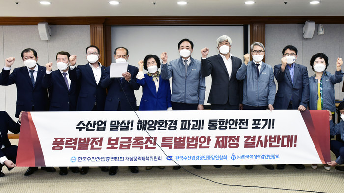 한국수산산업총연합회 해상풍력 대책위원회(이하“대책위”)는 26일 긴급 대책회의를 열고 최근 더불어민주당 김원이 의원이 대표발의한 '풍력발전 보급촉진 특별법률안'(이하“특별법안”)의 추진을 즉각 중단할 것을 강력하게 촉구하며 이른 시일 내에 전국 어업인과 수산업계가 참여하는 대규모 항의 집회를 열기로 했다.