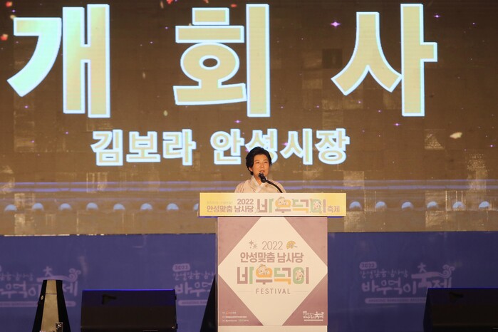 ▲김보라 시장이 지난 9월 30일 저녁 7시에 열린 ‘2022 안성맞춤 남사당 바우덕이 축제’ 개막식에서 개회사를 하고 있다. |
