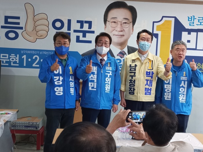 ▲6일 오후 문현4동 더불어민주당 백석민 구의원 후보[남구 1.2.3.4.동] 선거사무소 개소식에 참석한 박재범 남구청장 후보와 이강영 시의원 후보, 이명원 시의원 후보, 백석민 구의원 후보가 나란히 서서 기념촬영을 하고 있다. |