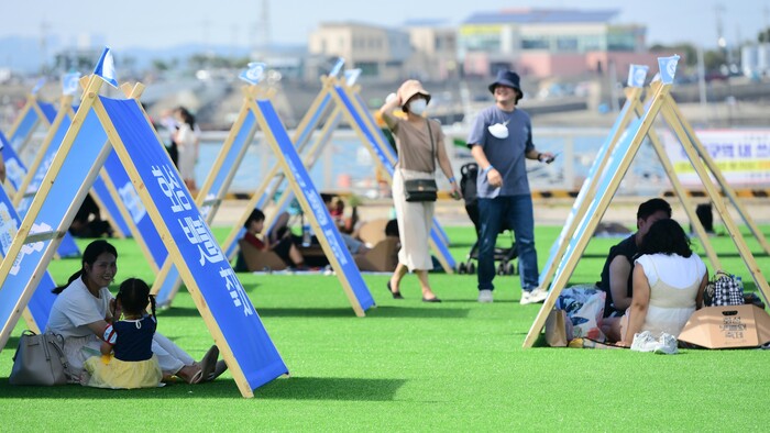 ▲ 화성뱃놀이축제장에 마련된 피크닉존에서 시민들이 햇빛을 피하고 있다. |