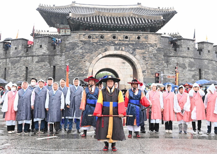 | ▲ 수원유수로 변신한 이재준 시장(가운데)이 장안문 앞에 서 있다. 수원시 제공 |