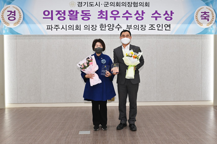 [로컬세계 강영한 기자]경기 파주시의회는 한양수 의장, 조인연 부의장이 지난 7일 파주시의회 1층 세미나실에서 열린 표창 수여식에서 경기도 시·군의회의장협의회 의정활동 최우수의원 상을 수상했다고 8일 밝혔다.