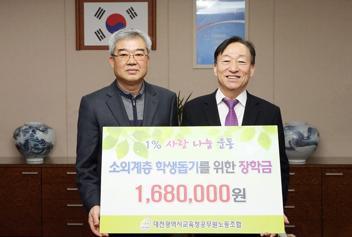 [로컬세계 조윤찬 기자]대전시교육청노동조합은 12일 ‘소외계층 학생 돕기 성금’ 168만원을 설동호 대전시교육감에게 전달했다.