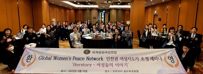 세계평화여성연합(이하 ‘여성연합’) 인천시지부는 16일 인천 오라카이송도파크호텔에서 인천·부천·김포 지역 여성 지도자의 교류와 협력을 통한 한반도 평화통일 기반 조성을 위해 ‘GWPN(Global Women’s Peace Network) 인천권 지도자 초청세미나’를 개최했다고 밝혔다.