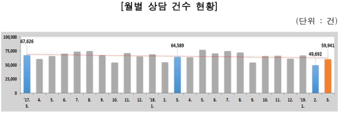 지난 3월 소비자상담은 5만9941건으로 전월(4만9692건) 대비 20.6%(1만249건) 증가했고, 전년 동월(6만4589건) 대비 7.2% 감소했다.
