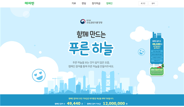 수도권대기환경청은 지난 5~6월 온라인 기부 포털 네이버 해피빈을 통해 ‘함께 만드는 푸른 하늘 캠페인’을 진행했으며 약 4만 9000건의 캠페인 참여 수와 총 1200만원의 기부금을 기록했다.