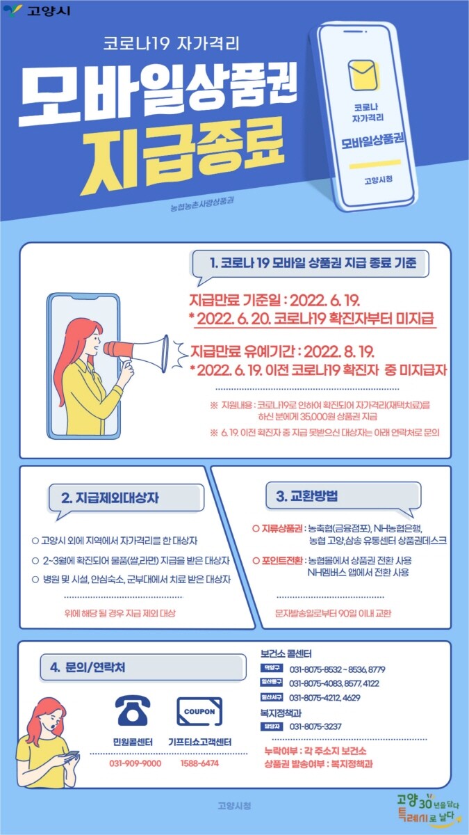 [로컬세계 = 이영원 기자]경기 고양시가 관내 코로나19 재택치료자들의 일상회복 지원을 위해 지급했던 구호물품 ‘농협 농촌사랑모바일상품권’ 지급을 6월 20일 확진자부터 종료한다고 밝혔다.