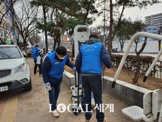 ▲가정연합 전국 회원들이 코로나 감염 예방을 위한 소독 방역 작업을 하고 있다.(사진=박재영 기자) |