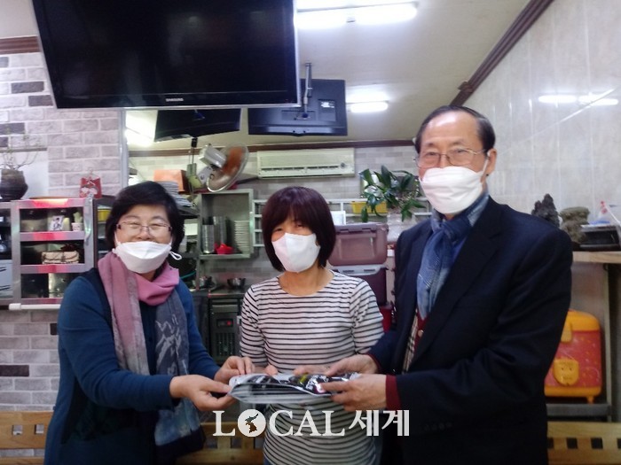 ▲가정연합 영남본부 관계자가 위생 마스크를 전달하고 있다. |