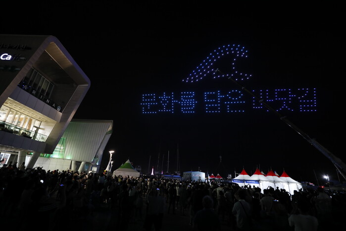 | ▲ 17일 밤 2022 화성 뱃놀이 축제가 펼져진 전곡항에서 드론 300대가 밤하늘을 수놓고 있다. |