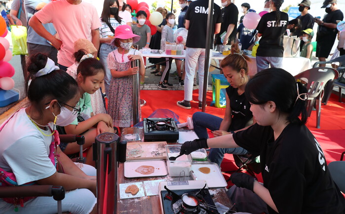 | ▲ 화성뱃놀이축제장에 마련된 달고나 체험을 하고 있는 아이들. |
