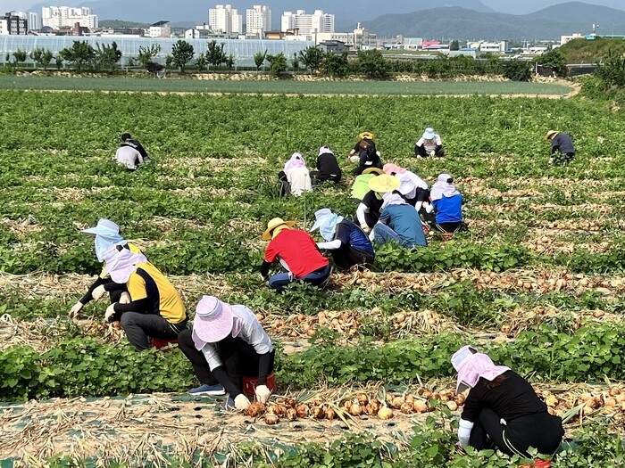 ▲20일(월) 강원도 철원군 신철원2리 마을에서 농협유통 하나로마트 창동점 임직원 30여명이 양파 수확 등 농번기 일손 돕기를 실시하고 있다. |