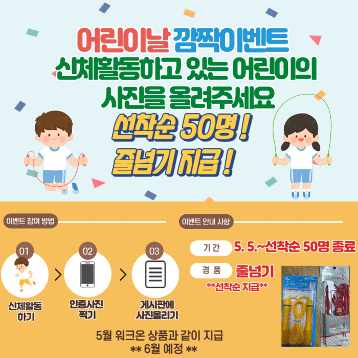 이벤트 기간은 5월 5일 어린이날 시작되어 줄넘기가 지급되는 선착순 50명을 마감하면 자동 종료된다.