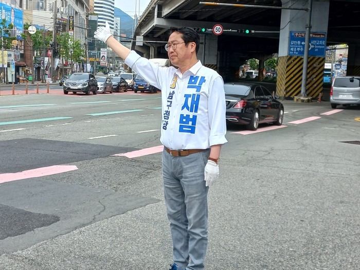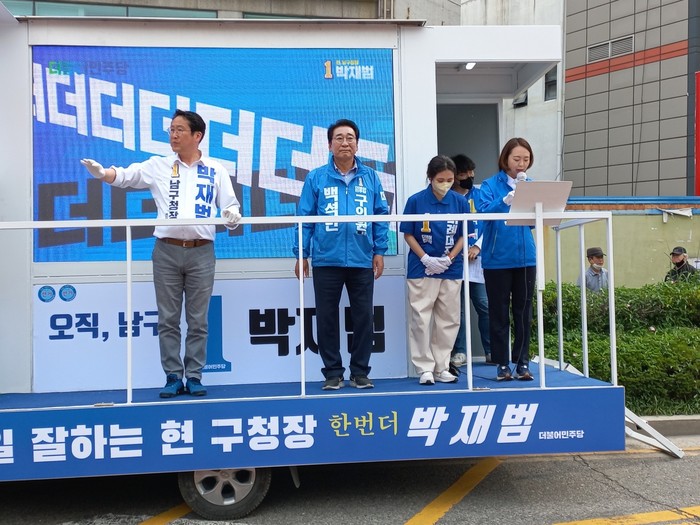 [로컬세계 부산=글·사진 맹화찬 기자]박재범(더불어민주당) 부산 남구청장 후보는 공식선거 첫날인 19일 오전 문현동 메가마트 앞 도로변에서 백석민, 박구슬 구의원 후보와 함께 공동으로 선거운동을 벌였다.