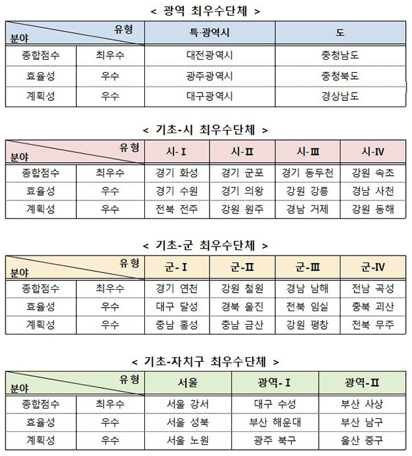 지방자치단체 재정분석 결과 종합점수 최우수단체로 광역은 대전·충남 등 2곳, 기초는 경기 화성·경기 연천·서울 강서구 등 11곳이 선정됐다.