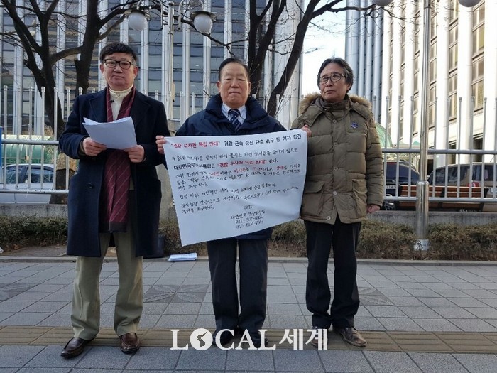 [로컬세계 박민 기자]대한민국 무궁화클럽 전경수 회장을 비롯해 김구종 이사장, 노철환 대변인이 11일 서울 서대문구 미근동 경찰청 민원실 앞에서 순경출신, 경감 근속승진 단축 및 경찰수사권 독립 반대 기자회견을 가졌다.