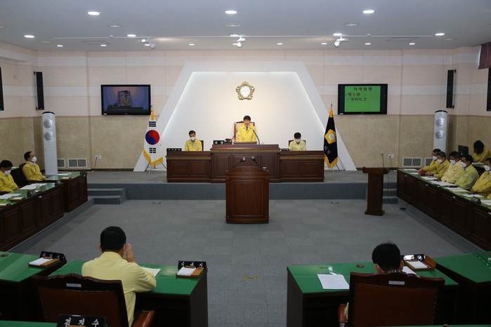 배광우 의장은 개회사를 통해 “주요사업장 현지 확인 시 사업 전반에 대한 문제점이나 주민 불편사항이 없었는지 세심하게 점검하고, 추경 예산안 심의에 있어서는 그동안 의정활동을 통한 주민 의견을 바탕으로 코로나19로 어려운 경제 회복을 위한 예산 등 예산이 적재적소에 합리적이고 효율적으로 편성되었는지 심도 있게 검토해 달라”고 동료 의원들에게 당부를 하고, 또한 “코로나19의 완전한 종식을 위하여 백신예방접종에 군민들의 적극적인 동참을 부탁하고, 백신접종 관계자들에게는 안전한 접종을 위해 세심하게 살펴봐 달라”고 말했다.
