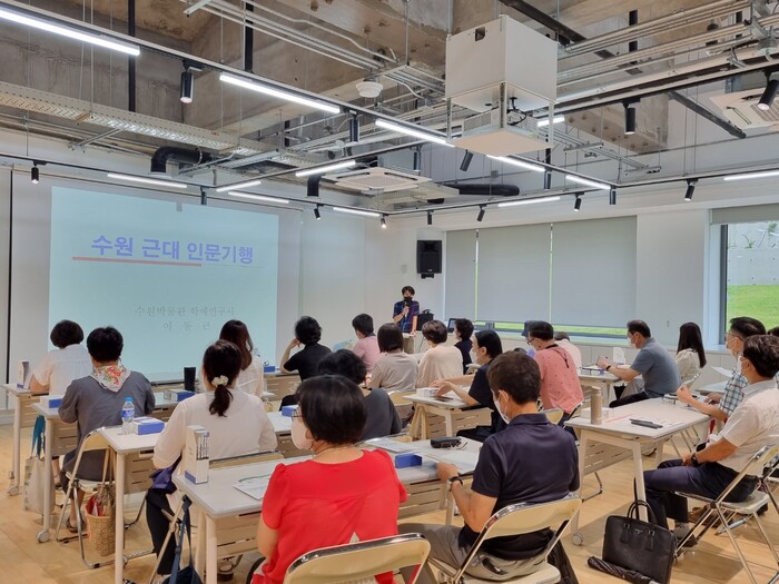 ▲13일 수원시 복합문화공간 ‘111CM’에서 열린 ‘수원 근대 인문기행 해설사 양성 기반교육’ 개강식. 수원시 제공 |
