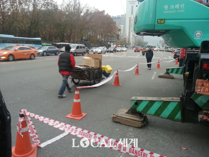 그런데 광장 인도와 차도 일부를 점거 채 공사 중인 현장 주변엔 안전 요원은 물론 안전보행에 관련된 어떠한 표지판도 없이 그저 공사 중임을 알리는 띠만 사다리차 주변에 둘러져 있을 뿐이다.