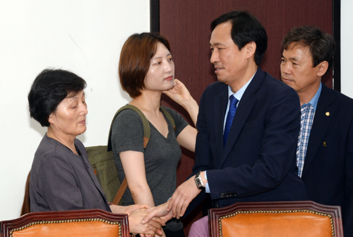 ▲우상호 더불어민주당 원내대표가 경찰의 물대포에 맞아 8개월째 사경을 헤매고 있는 농민 백남기씨의 가족과 인사를 나누고 있다. |