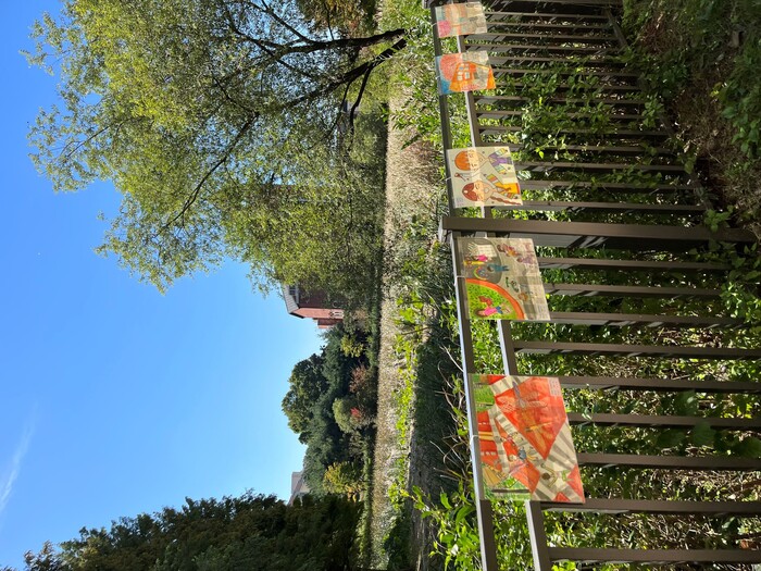 | ▲함양지 둘레길에 전시된 초등학생들이 그린 작품들. 용인특례시 제공 |