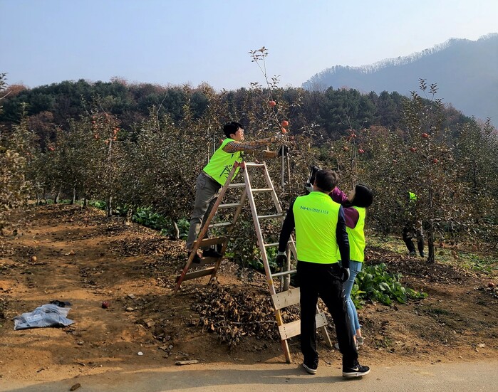 ▲ 농협경제지주 자재부 직원들이 지난 10일 강원도 춘천시 소재 강언덕 부엉이마을을 찾아 사과 수확 작업을 도우며 일손을 보태고 있다. |