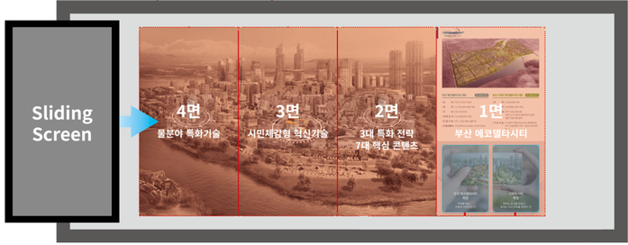 ▲슬라이딩 스크린을 통해 우리나라 스마트시티 국가시범도시를 증강현실(AR)로 구현·설명한다. 스크린 화면을 터치하면 해당 정보가 그림·영상으로 송출된다. |