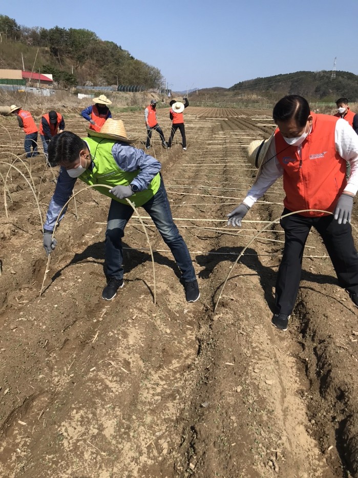 ▲농협 서울지역본부(본부장 황준구, 좌측)와 한국체육산업개발(주)(대표이사 김사엽, 우측)이 영농철 일손 부족으로 어려움을 겪고 있는 농가를 방문하여 농가의 일손을 돕고 있다. |