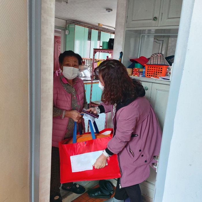 ▲유림동 지역사회보장협의체 위원이 한 어르신 댁을 방문해 세탁을 마친 이불을 돌려드리고 있다. 용인시 제공 |