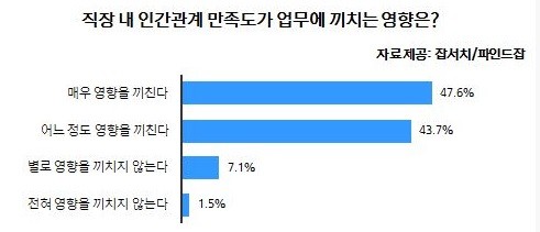 취업검색엔진 잡서치가 남녀 직장인 668명을 대상으로 실시한 ‘직장인 인간관계 의식’ 설문조사 결과, 직장인의 91.4%가 ‘인간관계 만족도가 회사업무에 영향을 준다’고 믿는 것으로 조사됐다.